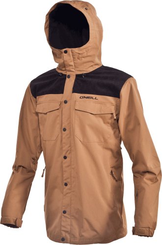 O'neill botton up jacket features critically taped seams, articulation, armpit venting, firewall, belt connector system, fixed hood, chin guard, single storm placket, audio pocket, goggle pocket, lif pass pocket, adjustable cuff, bottom adjustment, stow snowgaiter, key hook